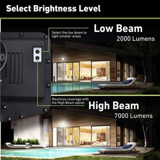 Light your backyard or business like a stadium TM with minimum light coverage of 86ft outward and 92ft wide – perfect to light up large areas at night. Selectable brightness level 7000 or 2000 Lumens. Selectable color temperature settings choose from Warm White (3000K), Bright White (4000K), or Daylight (5000K). IP65 Rated; Water and Dust Proof – ideal for outdoors wet locations with sturdy die cast aluminum construction, shatter-resistant lens, and cold weather rated with a minimum cold start temperature of negative 20°F. Wall or eave mounted for greater flexibility. 180° Degree adjustable passive infrared sensor (PIR) detects motion up to 100ft away. Time control setting options are available from test, 1-min, 5-min and 10-min to set how long the light will stay on after motion is no longer detected. Distance control options are from 10-ft, 20-ft, 50-ft and max which is up to 100-ft. Motion or switch controlled settings; light only operates after dark at motion setting, light operates day or night at switch control setting.LIGHT UP YOUR BACKYARD LIKE A STADIUM: Hyper bright motion sensor light with lawn coverage of 86 ft. outward and 92 ft. wide.